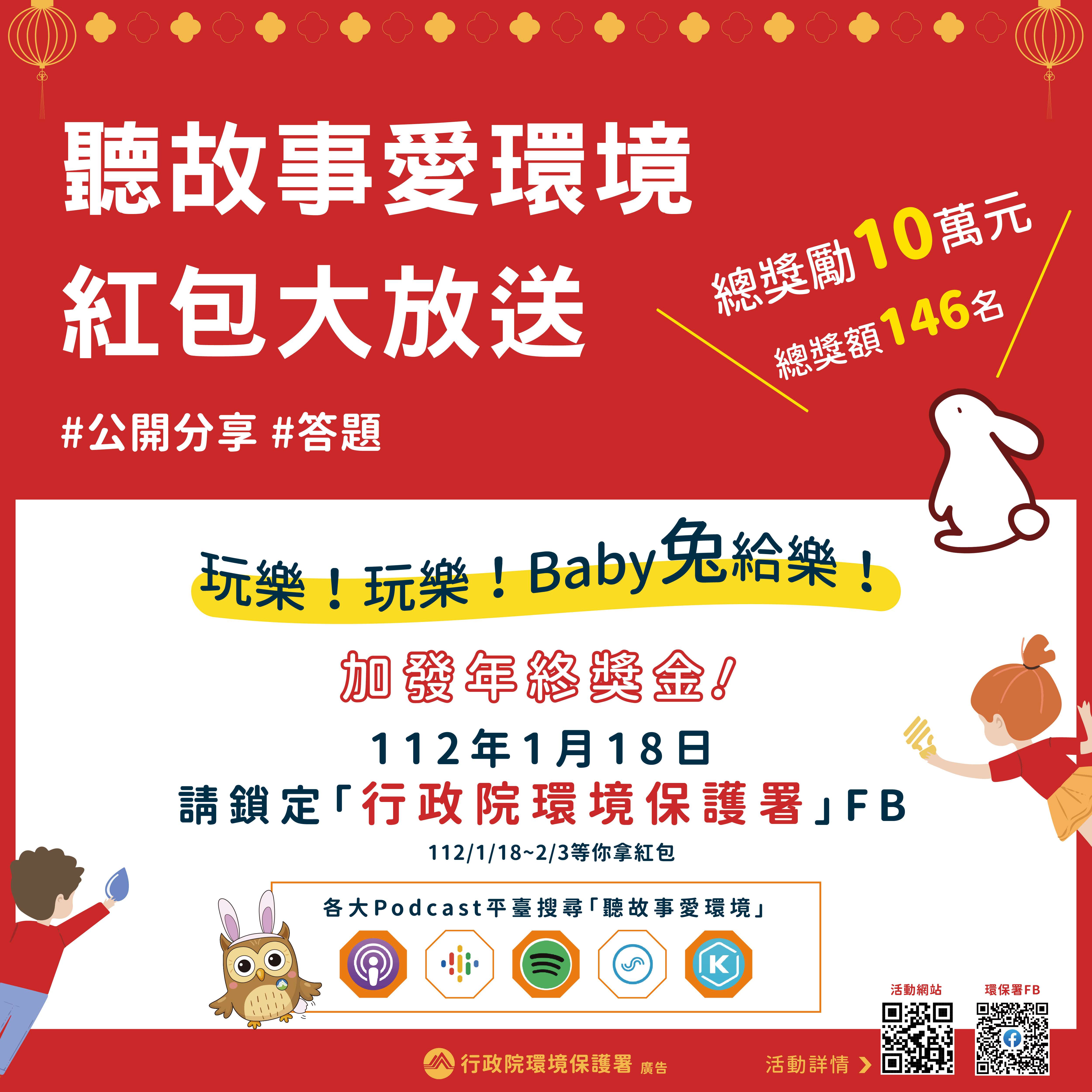二、為增進「聽故事愛環境」節目效益,於農曆新年期間辦理 旨揭活動,本活動期間為112年1月18日(星期三)至2月3 日(星期五),只要至「行政院環境保護署」臉書粉絲專頁完成指定「任務題」或「知識題」,即可有機會抽中超 商禮券或環保綠點,總獎額146名,總獎值高達新臺幣 10 萬元。