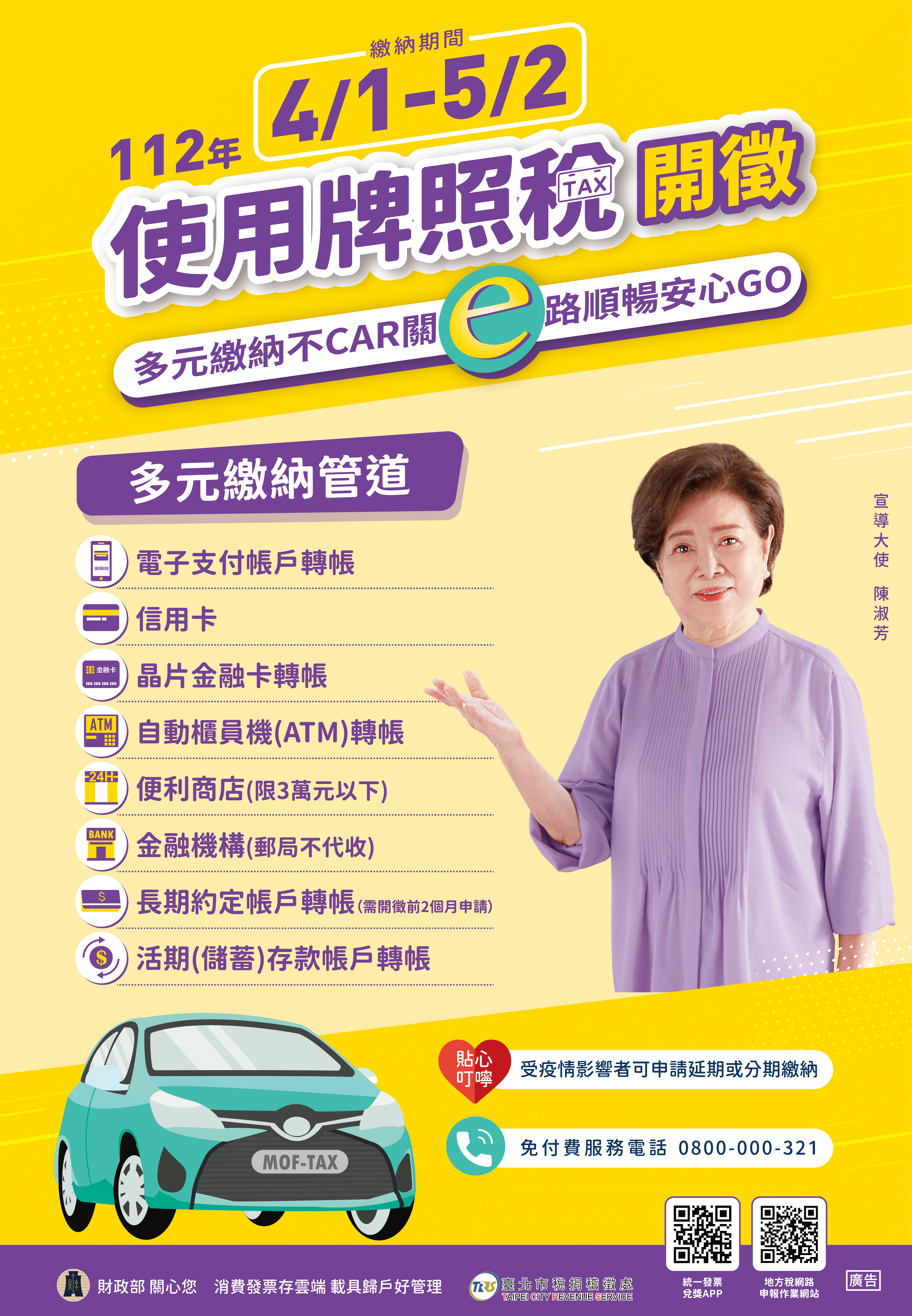 「112年自用汽、機車全期及營業用 車上期之使用牌照稅於112年4月1日開徵,北市稅處提醒您繳納期 限至112年5月2日止,請如期繳納,以免逾期受罰。