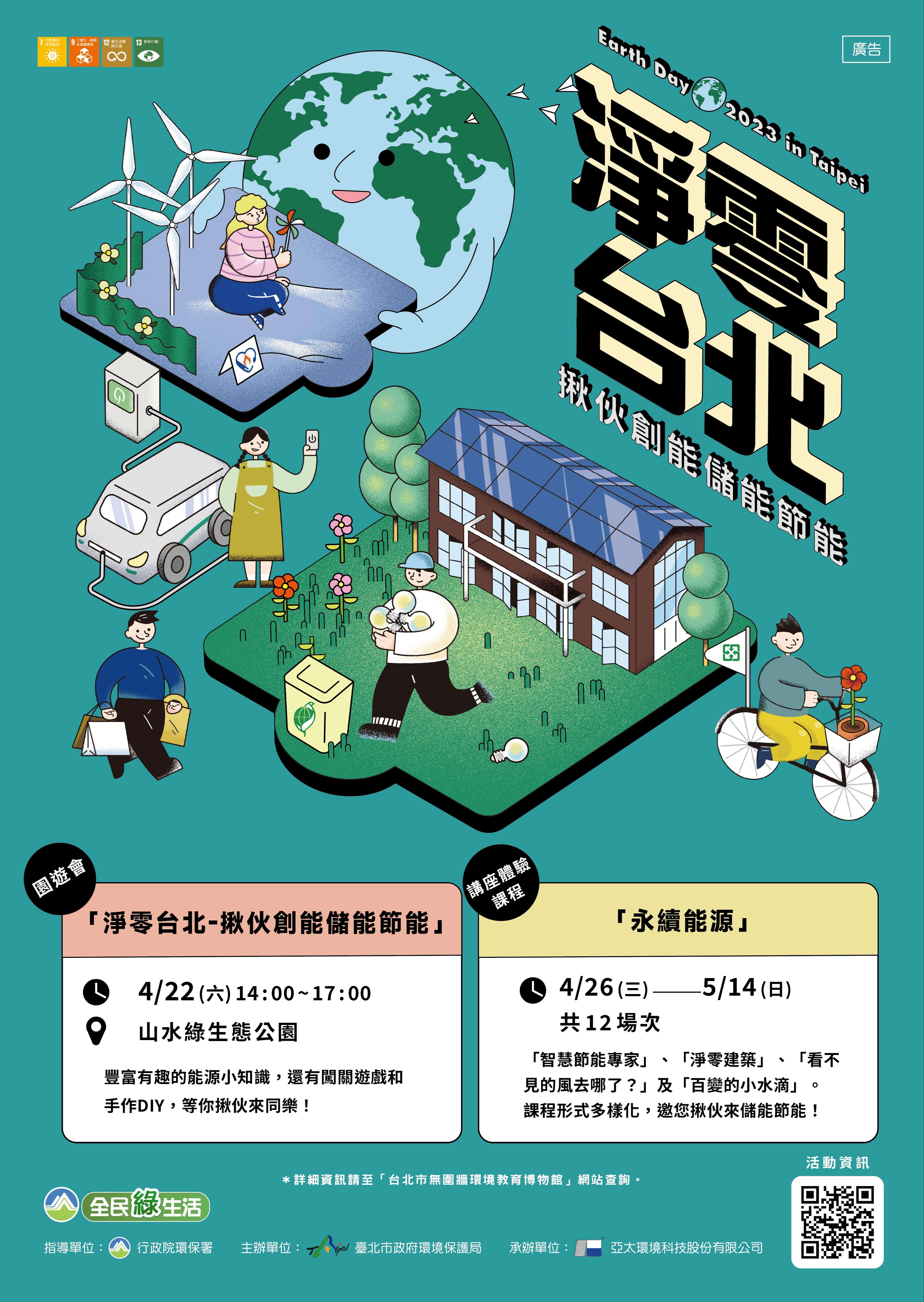 一、為響應地球日,本局將在4月22日(六)地球日當日下午2 時至5時,於本市南港山水綠生態公園辦理「淨零台北-揪 伙創能儲能節能」園遊會,現場設有攤位闖關活動,闖關成功者還可獲得精美小禮。另於4月26日(三)至5月14日 (日)辦理「永續能源講座」,邀請專業團隊,與民眾分享創能、儲能、節能及綠色建築於生活中之應用,活動簡 述如下: