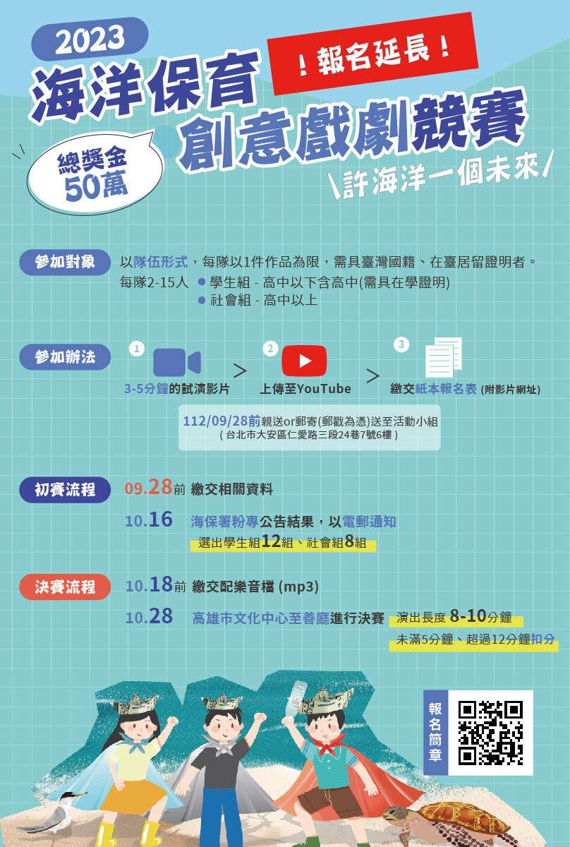 三、活動重要資訊如下 (一)活動主題:許海洋一個未來。 (二)報名期間:112年4月15日起至9月28日(星期四)止。 (三)報名方式1、錄製3-5分鐘創意戲劇競賽影片精華(或片段)。 2、將影片上傳Youtube平台。 3、填寫書面報名資料後,將報名資訊寄送至臺北市大安 區仁愛路三段24巷7號6樓(群策公關顧問有限公司活 動小組)。 (四)競賽方式:以戲劇表演方式呈現,不拘戲劇呈現形式, 例如舞台劇、皮影戲、布袋戲或其它形式均可報名。 (五)活動對象 1、社會組:大專院校以上及社會人士。 2、學生組:高中(職)以下。 (六)活動獎金:總獎金新臺幣50萬元整。