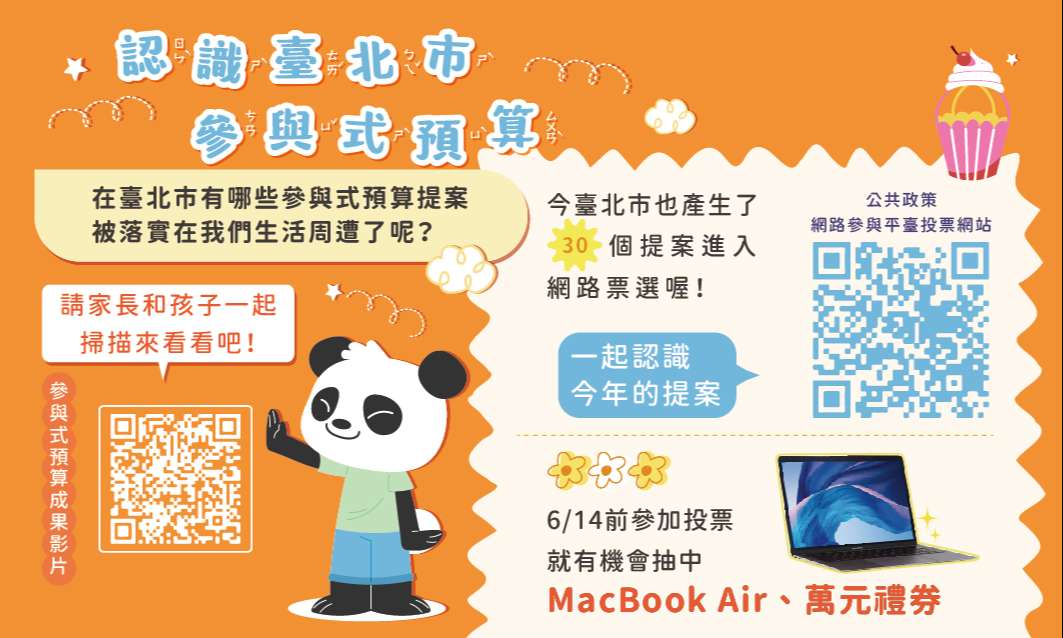 二、本案規劃於本市提案票選活動期間(113年5月31日上午9時 至113年6月14日下午5時止),鼓勵學童和家長共同參與, 製作本宣傳貼紙,期親子透過觀看影片,認識已執行之提 案,如臺北捷運站出口共享雨傘租借服務及循環杯免費借 用服務,
