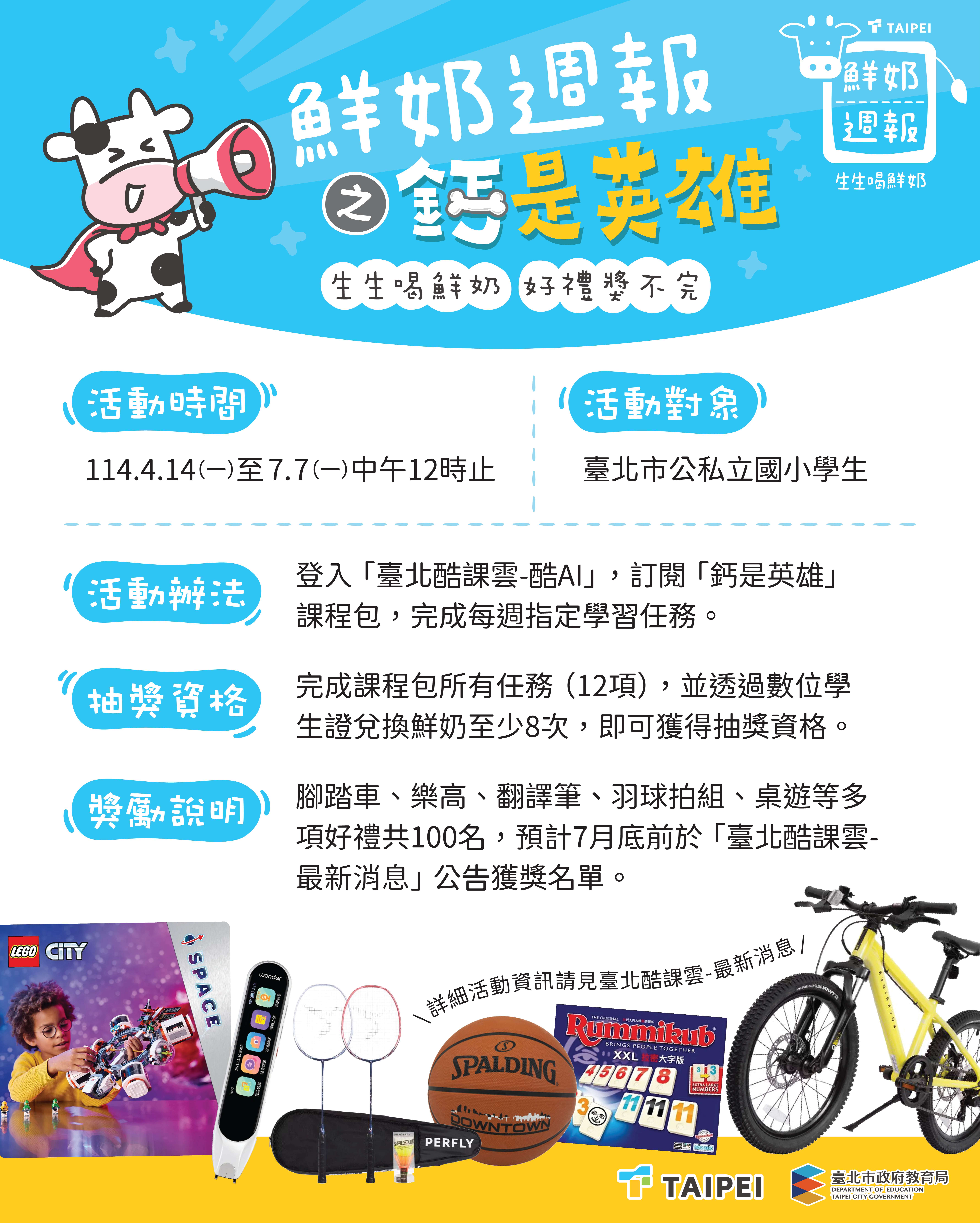 參加方式:透過校園單一身分驗證帳號登入「酷AI學習系統」(https://ailms.tp.edu.tw/),訂閱「鈣是英 雄」課程包。