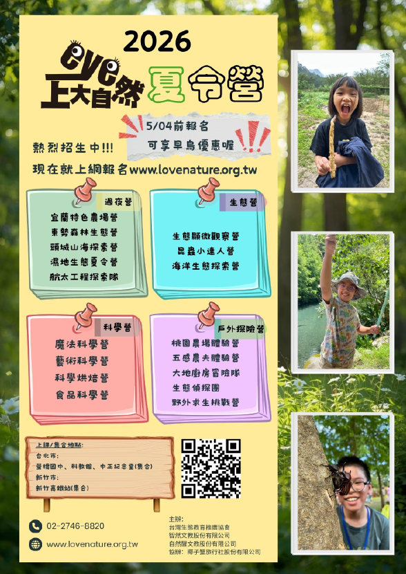 三、2026暑假兒童生態夏令營活動網址為https://www. lovenature.org.tw/,歡迎線上報名。