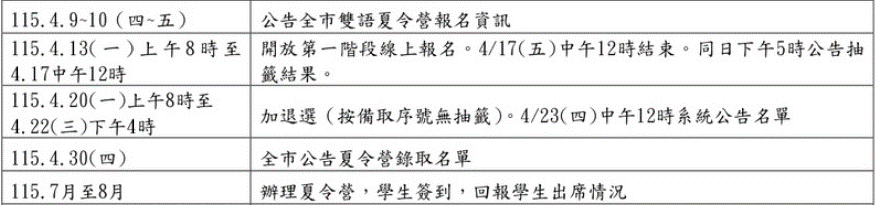 各位家長好,下圖為114學年度雙語夏令營相關期程。報名系統為酷課雲,相關簡章將於指定日期上線。明道國小雙語夏令營簡章請參閱附件