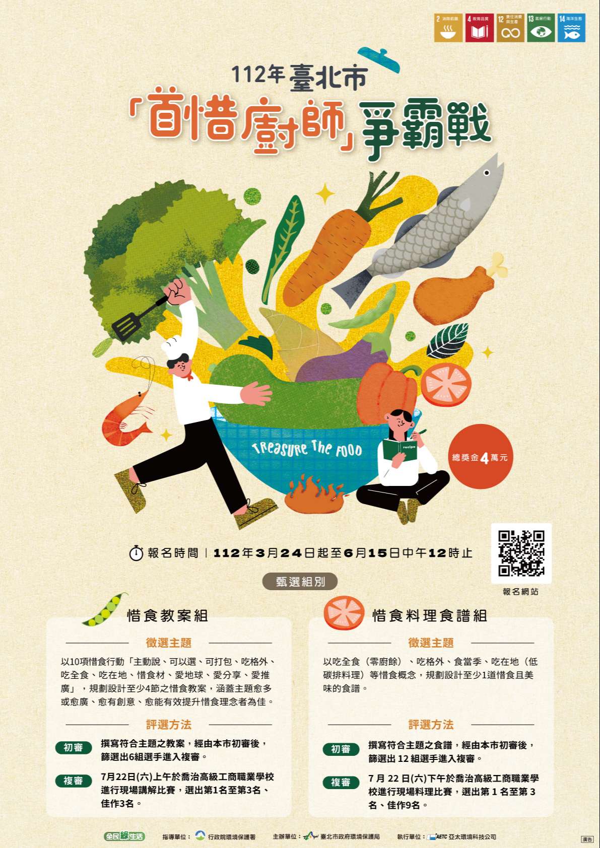 一、為呼應聯合國於2030年前零售及消費者減少50%食物浪費的 永續發展目標,儘可能發揮食材價值的最大化,本局將辦 理112年臺北市「首惜廚師」爭霸戰,於3月24日(五)至6 月15日(四)中午12時止開放報名,競賽分為「惜食料理 食譜組」及「惜食教案組」,各組前3名除可獲得獎金外, 各組第1名將代表北市參加環保署辦理之全國賽。本次「首 惜廚師」甄選活動分為初審及複審2階段進行,初審訂於7 月上旬進行書面評審,並於7月7日(五)於臺北市環境保護局官網及「臺北市無圍牆環境教育博物館網站」公布入選者,複審將於7月22日(六)於北市喬治高級工商職業學校進行,透過實作方式選出優勝者,本競賽複審簡述如下: