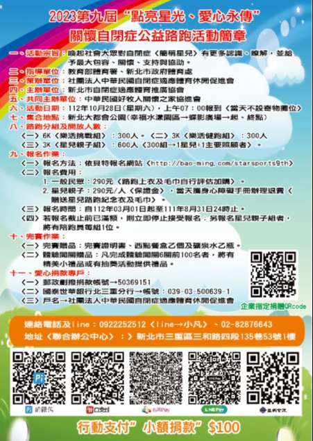 三、然為讓星兒家庭們能走到戶外與一般民眾享有同樣的體育 休閒生活,遂策劃辦理此項關懷自閉症公益路跑活動,相 關內容如下: (一)時間:112年10月28日上午7-12時。(二)地點:新北大都會公園→幸福水漾園區 (三)路跑組別及人數: 1、6K〈樂活挑戰組〉:300人。 2、3K〈樂活健跑組〉:300人 3、3K〈星兒親子組〉:600人〈300組→1星兒+1主要照顧 者〉。 (四)費用: 1、一般民眾: 290元〈路跑上衣及毛巾自行評估加 購〉。 2、星兒親子: 290元/人〈保證金〉,當天攜身心障礙手 冊現場辦理退費〈贈送星兒路跑記念衣及毛巾〉。 (五)報名時間:112年3月1日起至112年8月31日止。