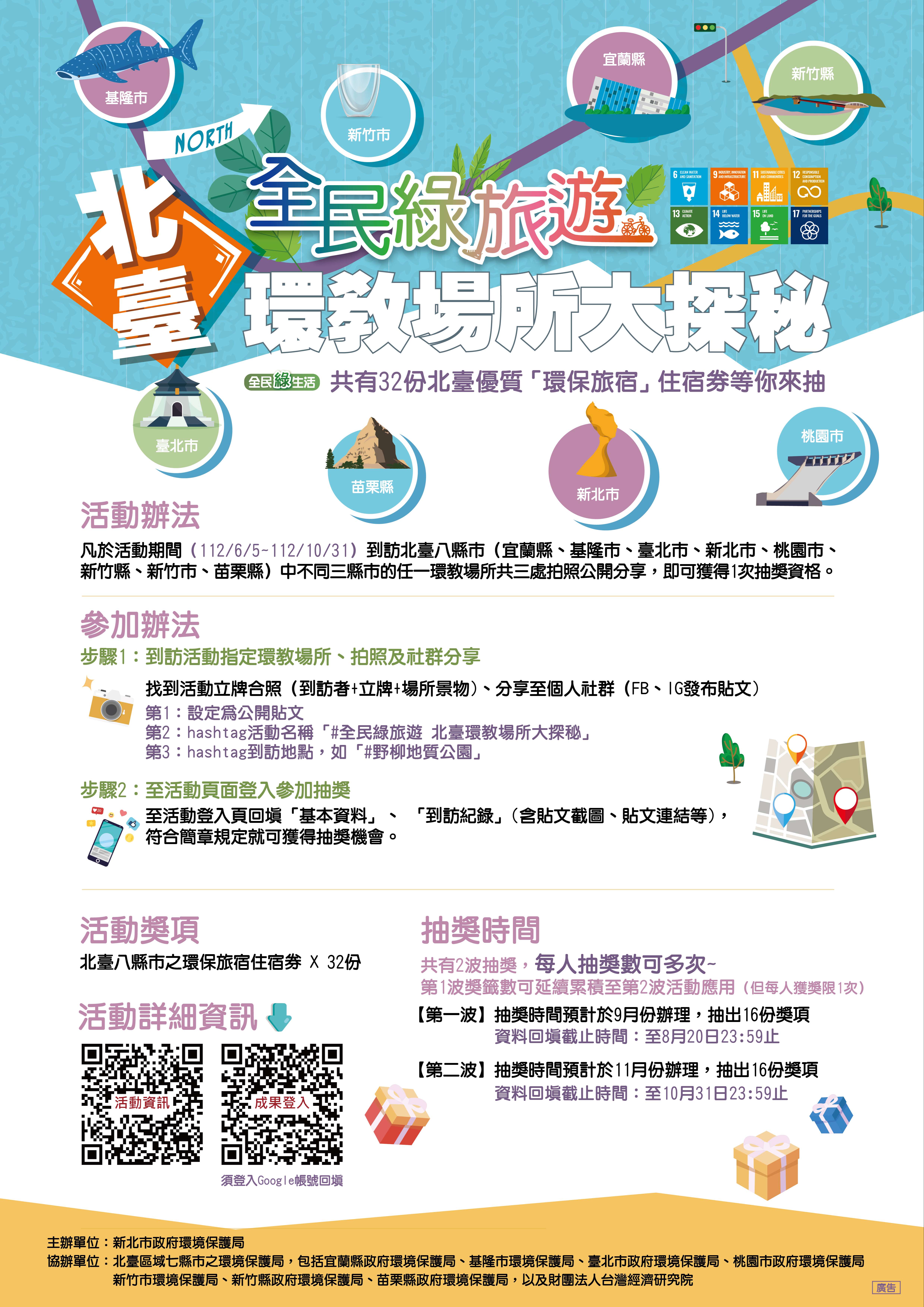 (一)凡本國籍之學生及民眾於112年6月5日至 10月31日期間 到訪北臺八縣市中(包括宜蘭縣、基隆市、新北市、臺 北市、桃園市、新竹縣、新竹市及苗栗縣)不同三縣市的環境教育設施場所共三處依活動規定拍照公開分享, 即可獲得1次抽獎資格,每人抽獎數可多次,但所有抽獎 數之到訪場所不得重複,且獲獎限1次。
