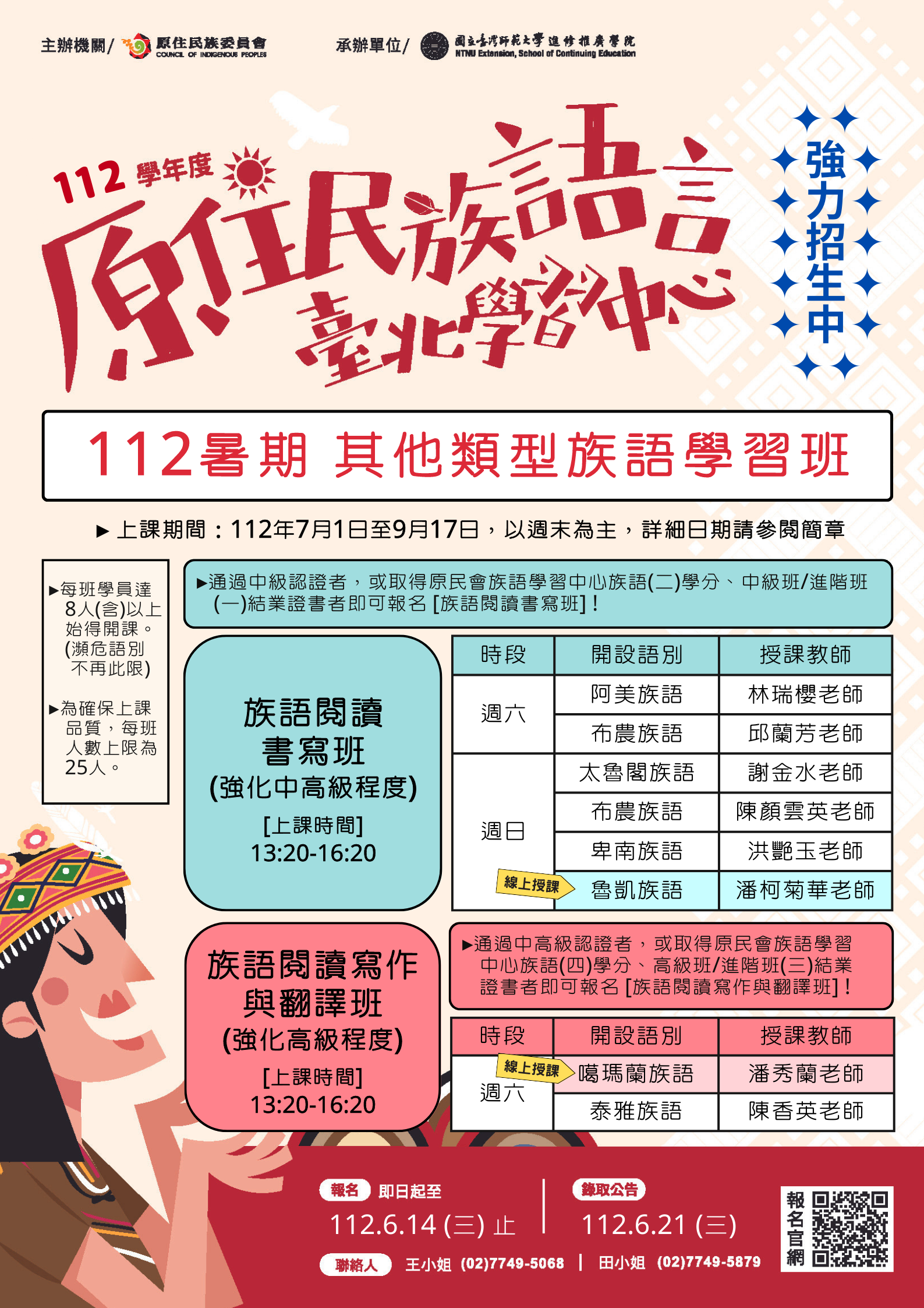 國立臺灣師範大學辦理原住民族語言臺北學習中心112學年度暑期「其他類型族語學習班」招生 詳細辦法請參考附件。