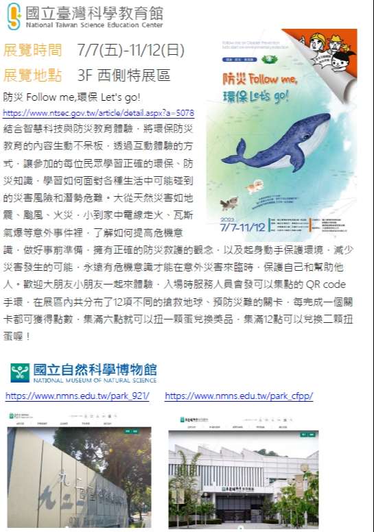 鼓勵所屬師生參與國立臺灣科學教育館、 國立自然科學博物館及國立科學工藝博物館年度辦理防災教育活動。
