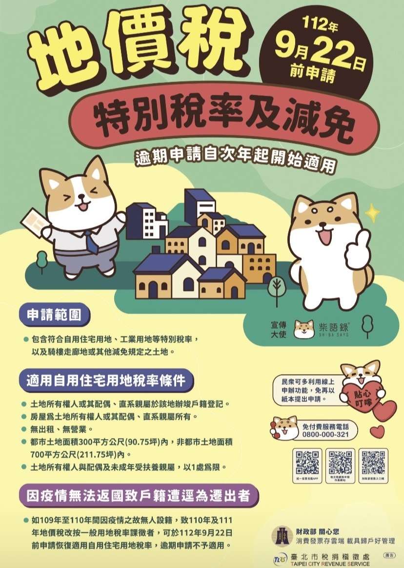 土地如符合地價稅自用住宅規 定,請於9月22日前向土地所在地之地方稅稽徵機關申請適 用優惠稅率,逾期申請者自次年起適用,核准後應避免戶 籍遷出而遭補稅。臺北市稅捐稽徵處文山分處關心您!