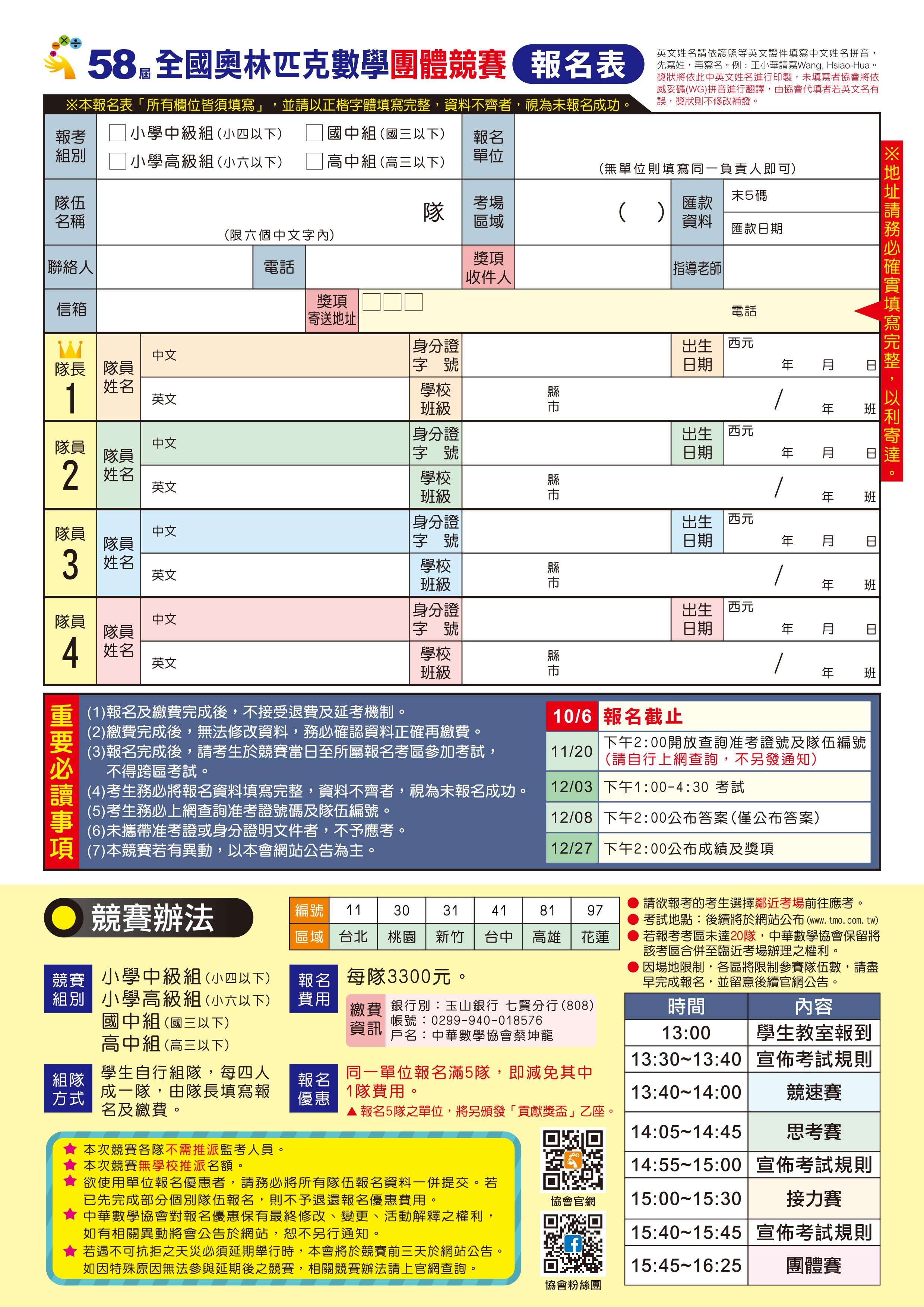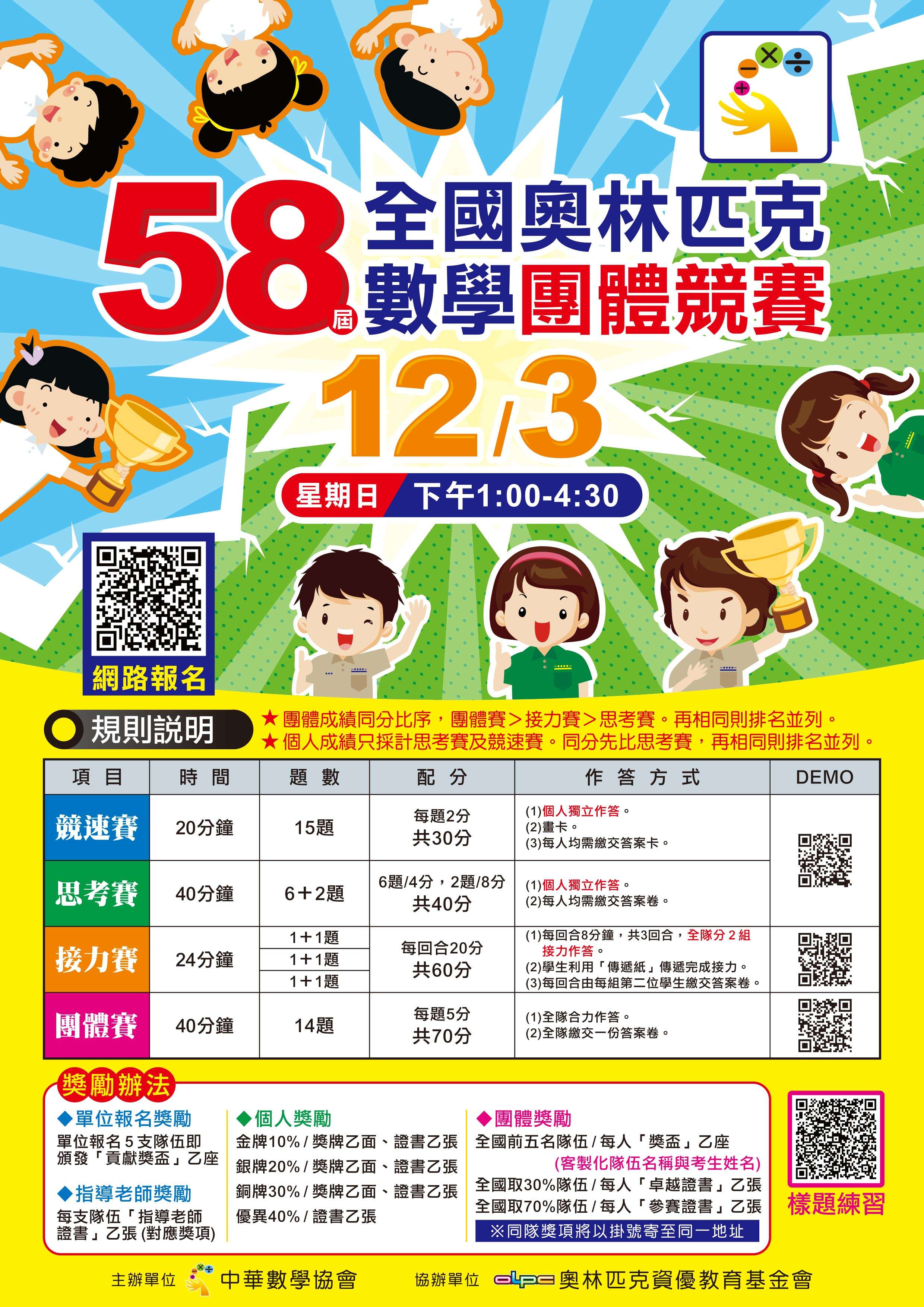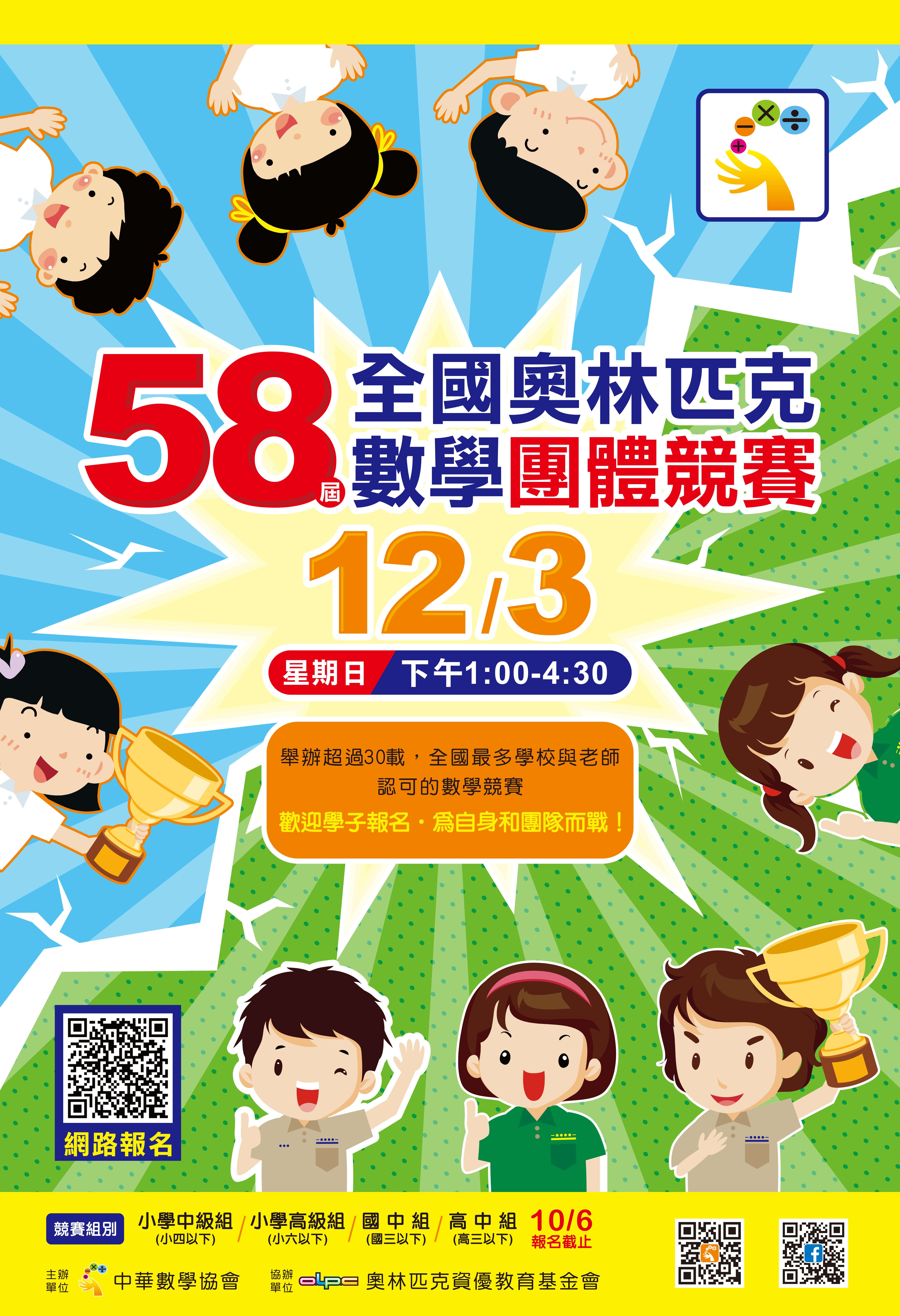 中華數學協會於112年12月3日(日)舉辦 「第58屆全國奧林匹克數學團體競賽」 活動計畫及報名資訊請參考附件。
