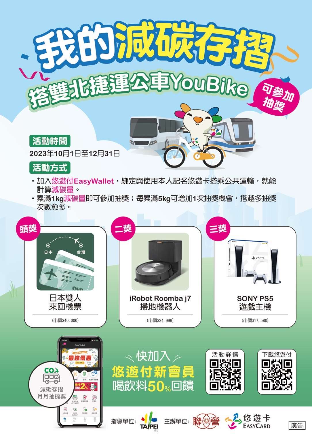 一、活動於112年10月1日至112年12月31日止,只要加入 「悠遊付Easy Wallet」APP會員,綁定與使用本人記名悠遊卡,搭乘雙北公共交通運具(公車、捷運、輕軌及YouBike)就能計算減碳量。累計滿1kg減碳量即可獲得當月抽獎資格1次,每累計滿5kg,可再增加1次抽獎機會,累計滿10kg則多2次,以此類推,搭乘公共運輸越多,就有越 多中獎機會。
