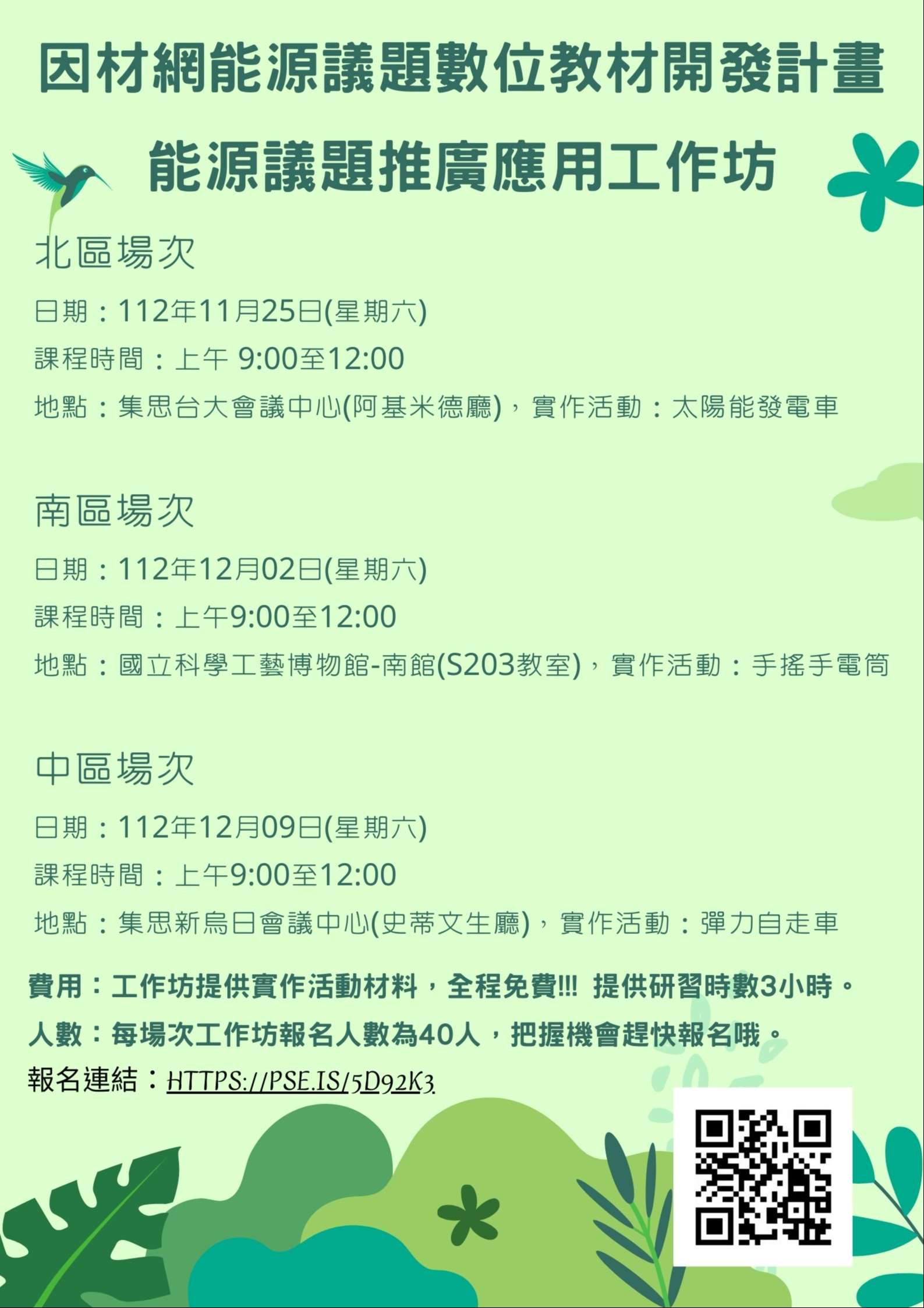 四、參與須知:工作坊提供實作活動材料,全程免費。全程參與工作坊之教師將核發研習時數3小時;未全程參與者,將不核予研習時數。