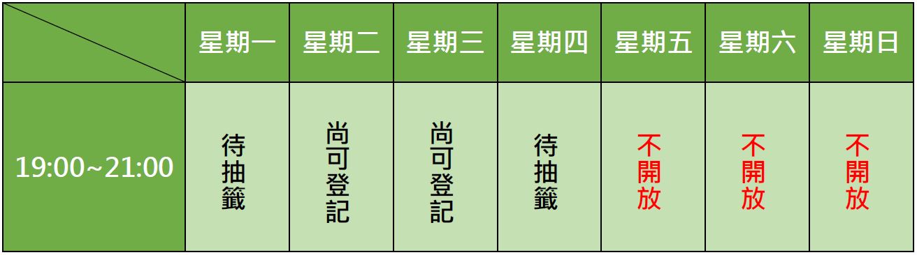 一、週一及週四時段同時有4位申請人登記,於112年12月27日(星期三)上午9時在本校總務處抽籤決定之,未抽中者依序列為候補。
