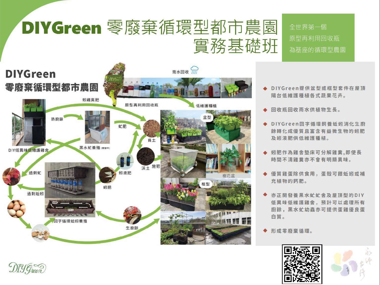 二、DIYGreen 循環型都市農園是全世界第一個以回收瓶為基座 的 DIY 循環型農園。可在水泥地上創造出綠地供種蔬果花 卉,適合從小孩至長者所有年齡層DIY施作;有關DIYGreen 單盆體驗班及DIYGreen盆型基礎班兩門課程,詳細課程訊 息及報名請至https://reurl.cc/krrY6n,檢附課程DM一 份。