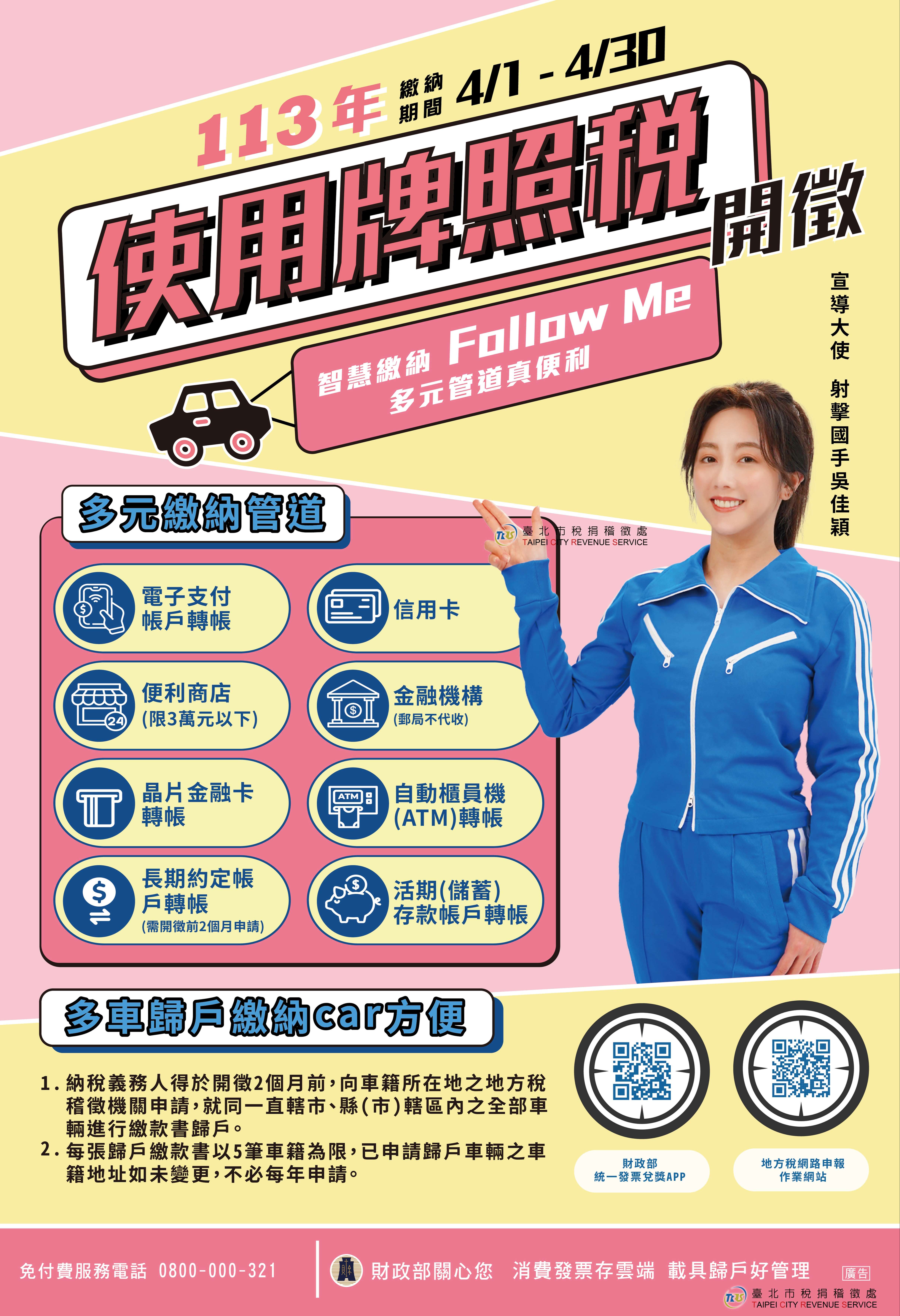 「113年自用汽、機車全期及營業用車上期之使用牌照稅於4月1日開徵,北市稅處提醒您繳納期限至4月30日止,請如期繳納!」