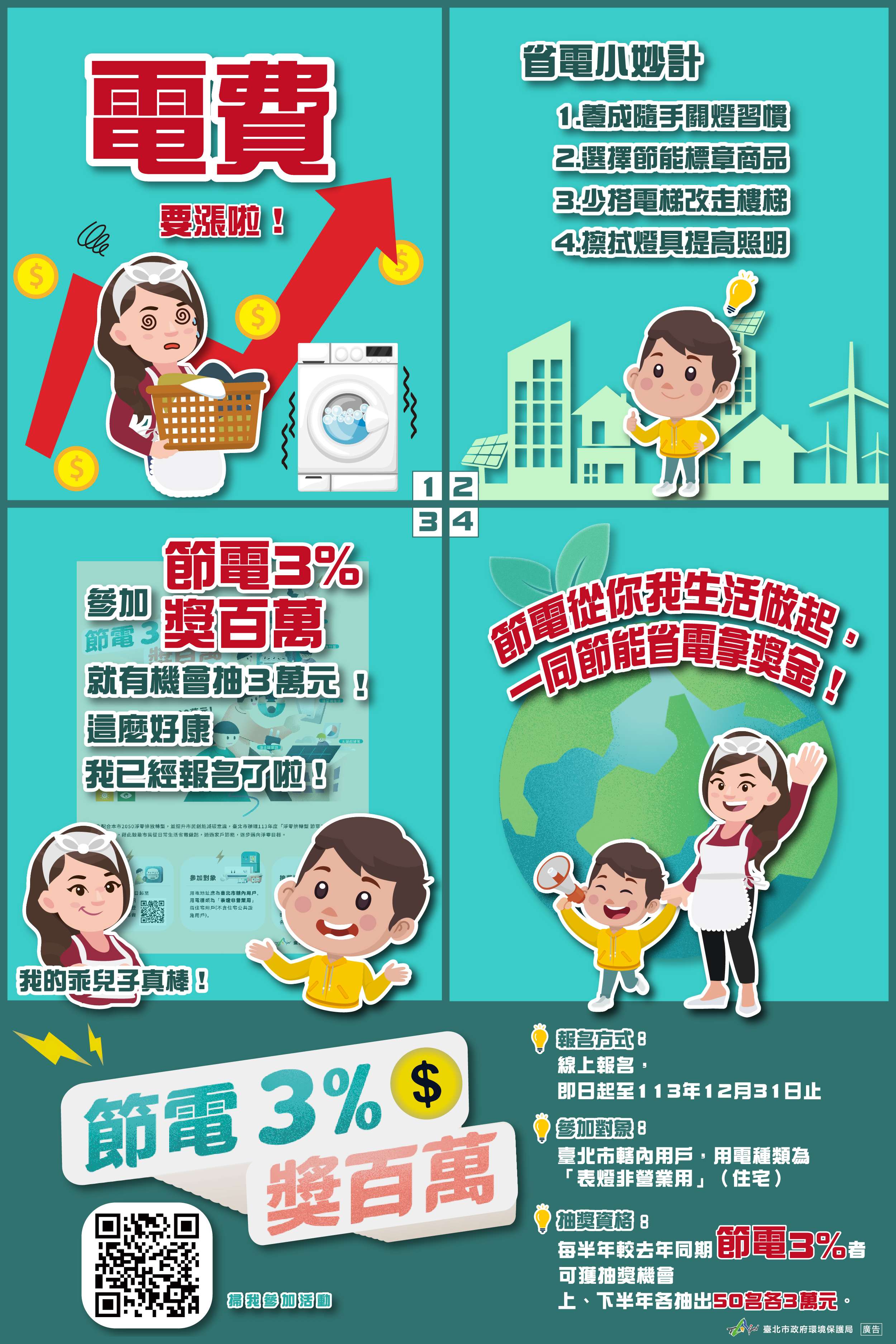 二、為鼓勵市民落實節能減碳行動,本府環境保護局於113年3 月1日推出旨揭活動,因應本市2050淨零排放及經濟部宣布 4月起調漲電價,民眾於日常生活中精進用電習慣等行動更 顯重要。