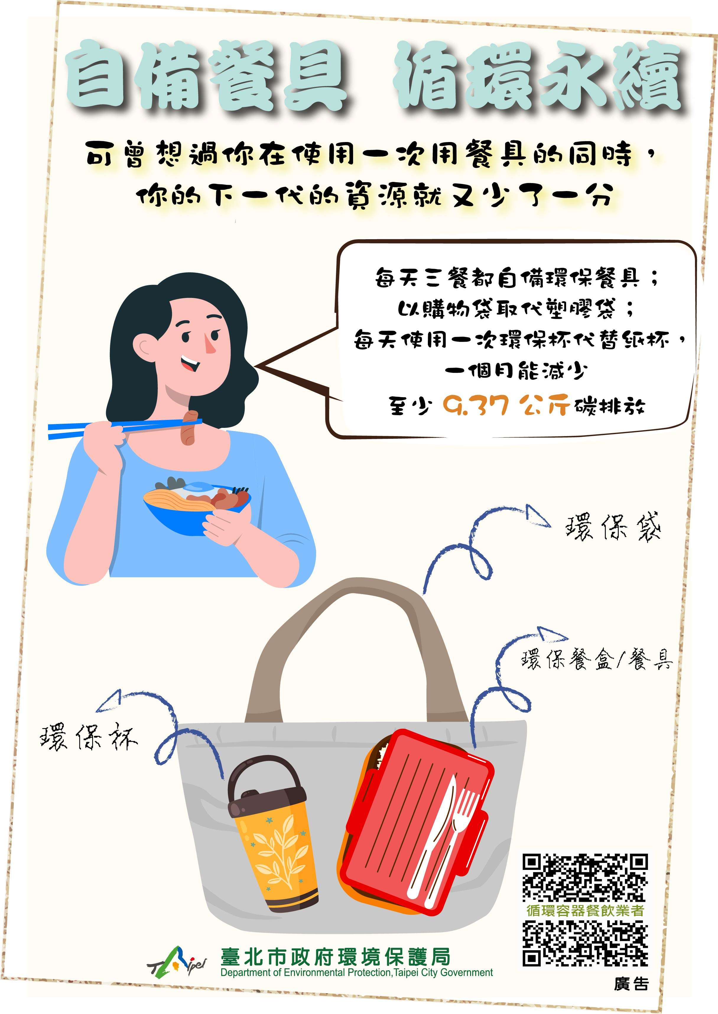 二、依前項作業指引,各機關學校辦理會議、訓練及活動,膳食訂購以可重複清洗餐具及容器裝填之餐食(如鐵盒便 當)為主,或提供便當以外非塑膠包裝之餐點,如點心麵 包盒、水果盒、飯捲、飯糰、三明治、潛艇堡等;飲用水 則提供飲水機或桶裝水/飲料,並宣導參與者自備環保杯, 以環保綠行動來響應一次用產品減量,協力推動源頭減廢 環境政策。