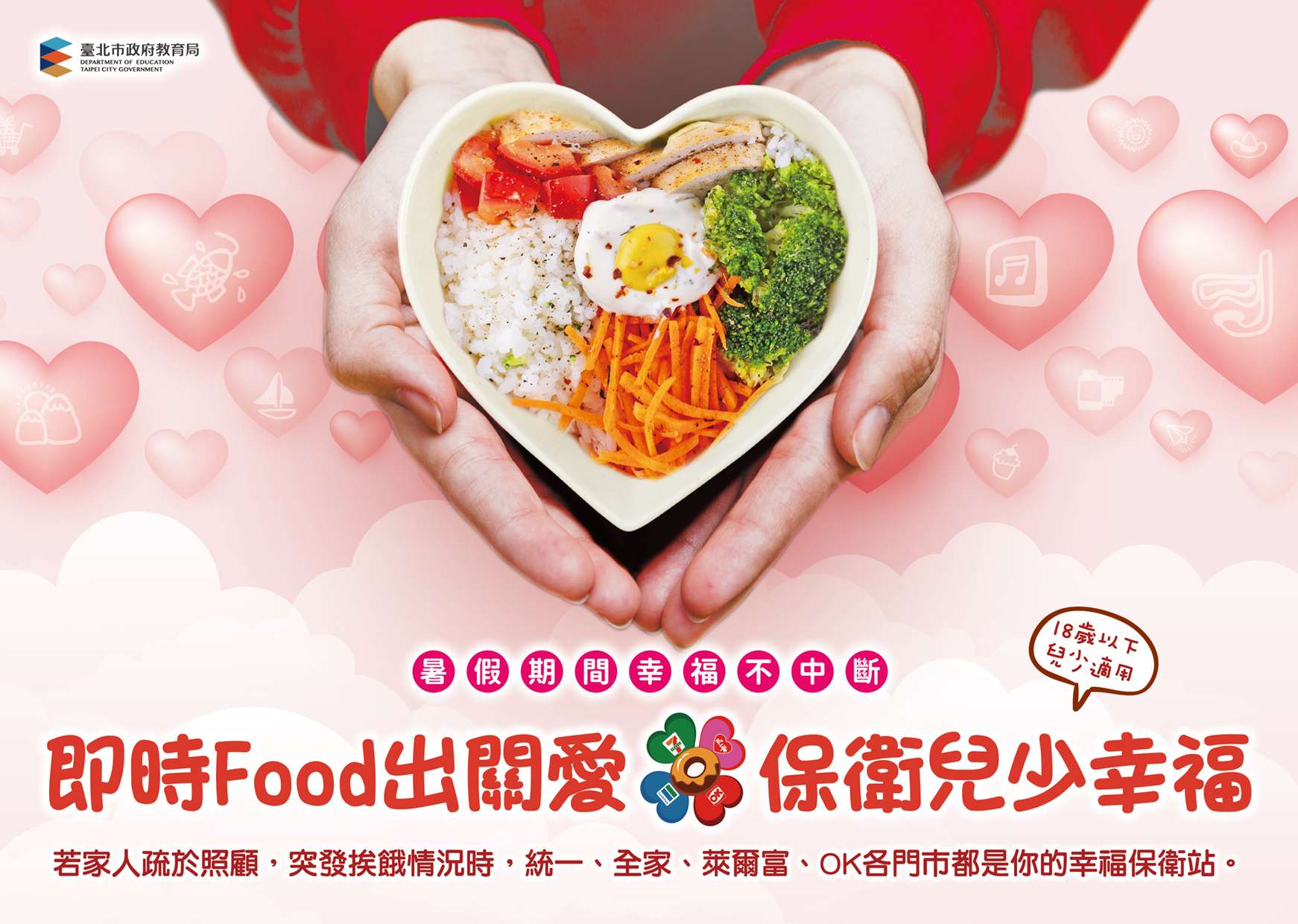 三、旨揭計畫業已於113年1月20日正式啟動,因應暑假即將來 臨,為讓在假期中遭遇急難之兒少能善用資源,請各校利 用本學期末之集會時間再次向全校師生宣導幸福保衛站, 也透過家長會或家長群組轉知相關訊息,讓所有親師生知 道「暑假期間陷困之兒少只要身處北臺八縣市範圍內,都 可以就近向四大超商門市求助取餐。」