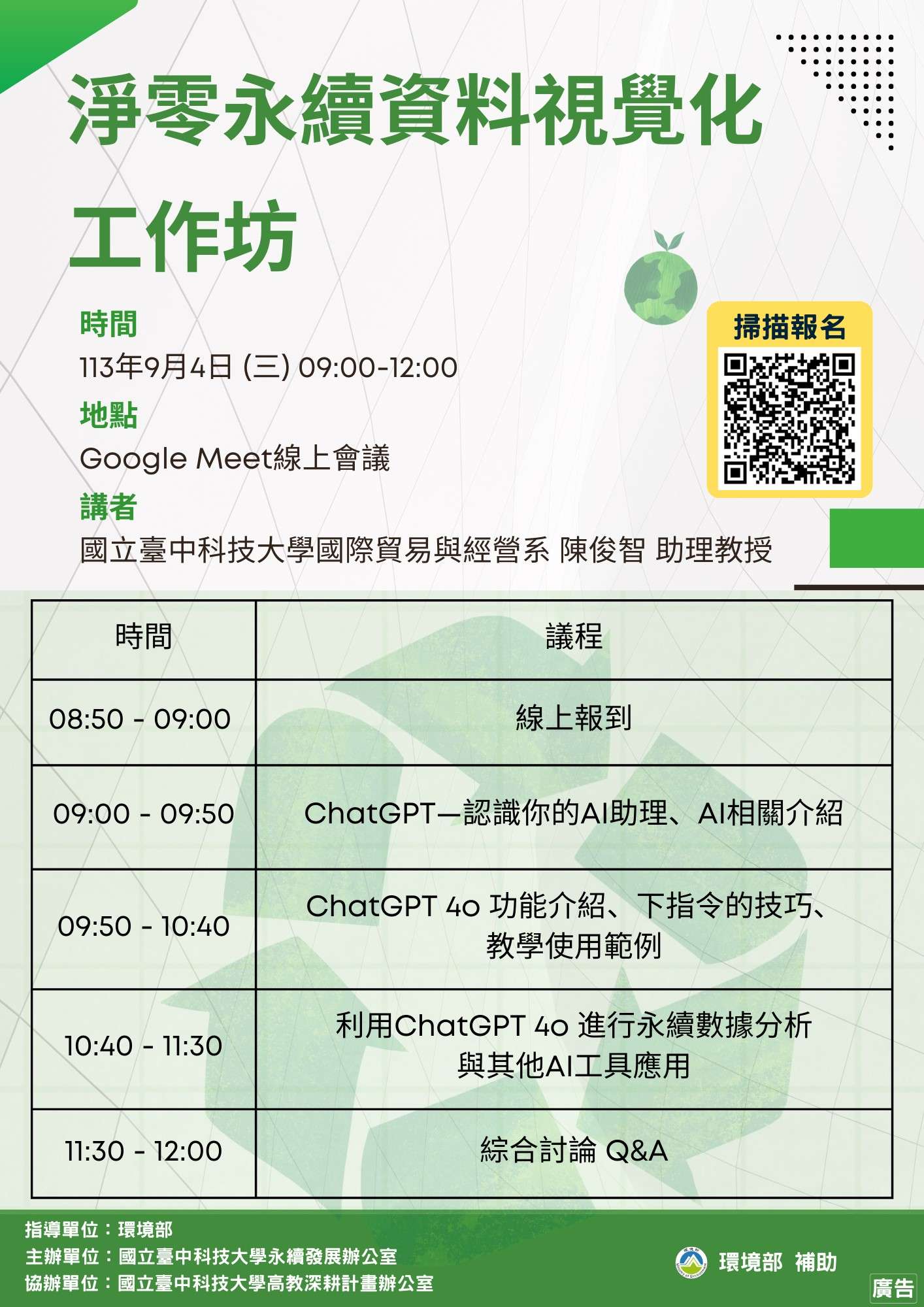 一、「淨零永續資料視覺化工作坊」相關活動訊息如下:(一)活動時間:113年9月4日(星期三)9時至12時。 (二)活動地點:Google Meet線上會議。 (三)參加對象:邀請全國高級中等以下學校教師、以及對議 題有興趣的相關教師。 (四)報名連結:https://forms.gle/vUvZ4srMb4cp5zrU9。