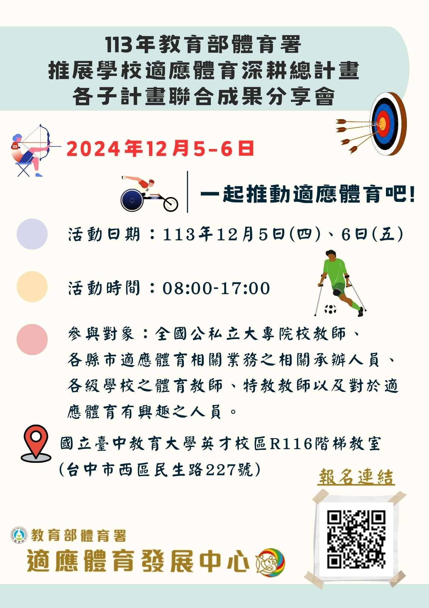 二、為提升全國各地方政府和各級學校的適應體育推動量能, 促進跨階段、跨領域、跨區域之教師得以共同分享資源及 交學習,並提供有興趣申請適應體育相關計畫的單位一同 觀摩,該署特委請國立臺灣師範大學辦理旨揭活動。