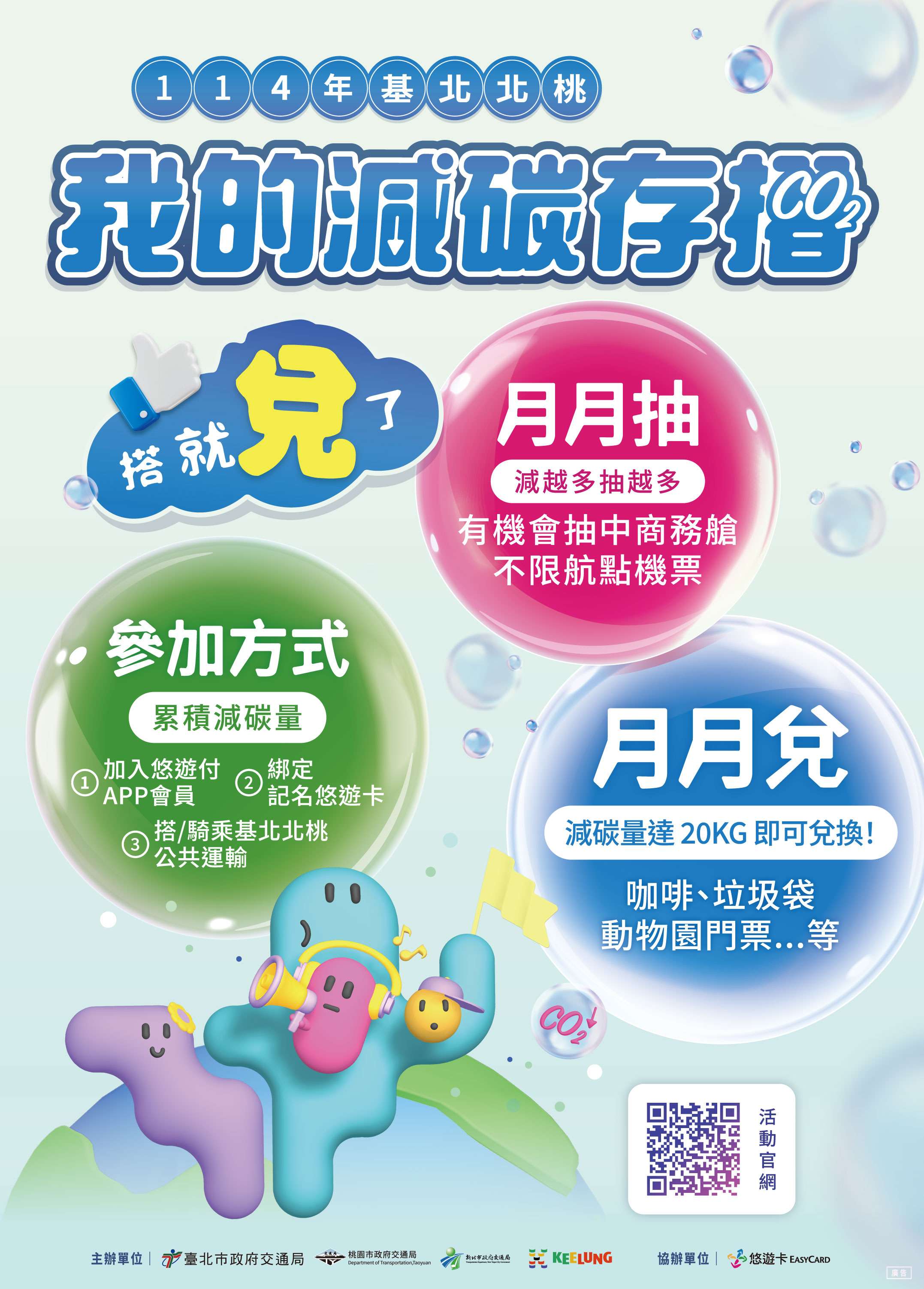 為攜手市民多加使用公共運輸,以朝淨零碳排目標前進, 由政府、企業一起帶動全民綠運輸減碳,113年由基北北桃 四市交通單位、公共運輸業者及悠遊卡股份有限公司共同推動,114年度擴大辦理並增加兌獎制活動,民眾累積達一 定減碳量即可登錄兌換獎項,提高民眾參與誘因。