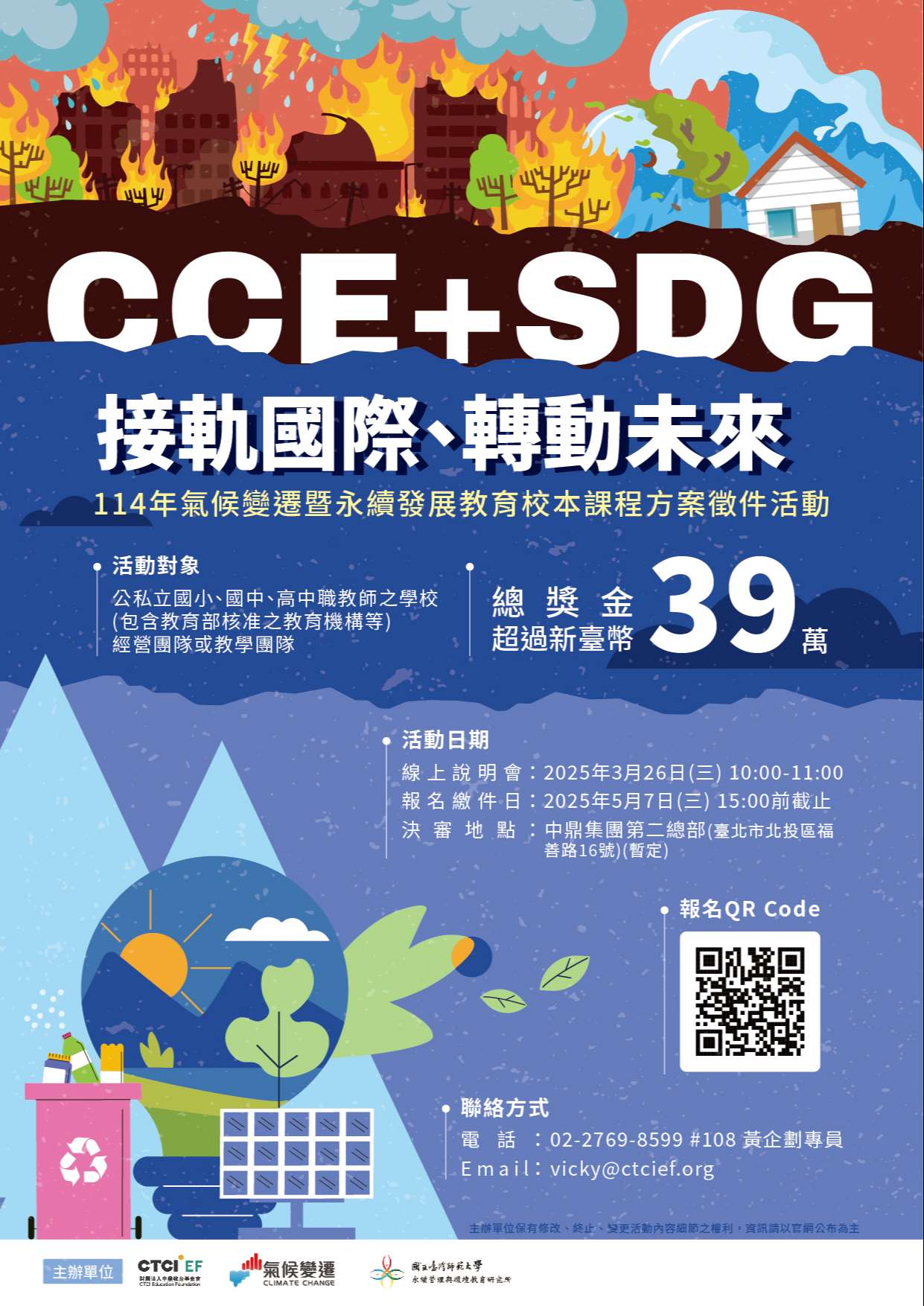 一、為強化我國各級教育人員對於氣候變遷教育(CCE, climate change education)、永續發展教育(ESD, education for sustainable development)與聯合國永續 發展目標(SDGs)的認識,響應我國《氣候變遷因應法》對 於氣候變遷教育的重新定位,與賴總統於國家氣候變遷對 策委員會第三次會議之指示(https://www.president.gov. tw/News/39011),朝向「氣候變遷暨永續發展教育」 (CCESD=CCE+ESD) 國際趨勢邁進,連結永續發展目標 (SDGs)後,成為CCESDG。中鼎教育基金會(CTCIEF) 特與教 育部氣候變遷教學資訊平臺氣候變遷教育推動計畫、國立臺灣師範大學永續管理與環境教育研究所共同籌辦旨揭徵 件活動,以鼓勵教師研發「氣候變遷暨永續發展教案」。