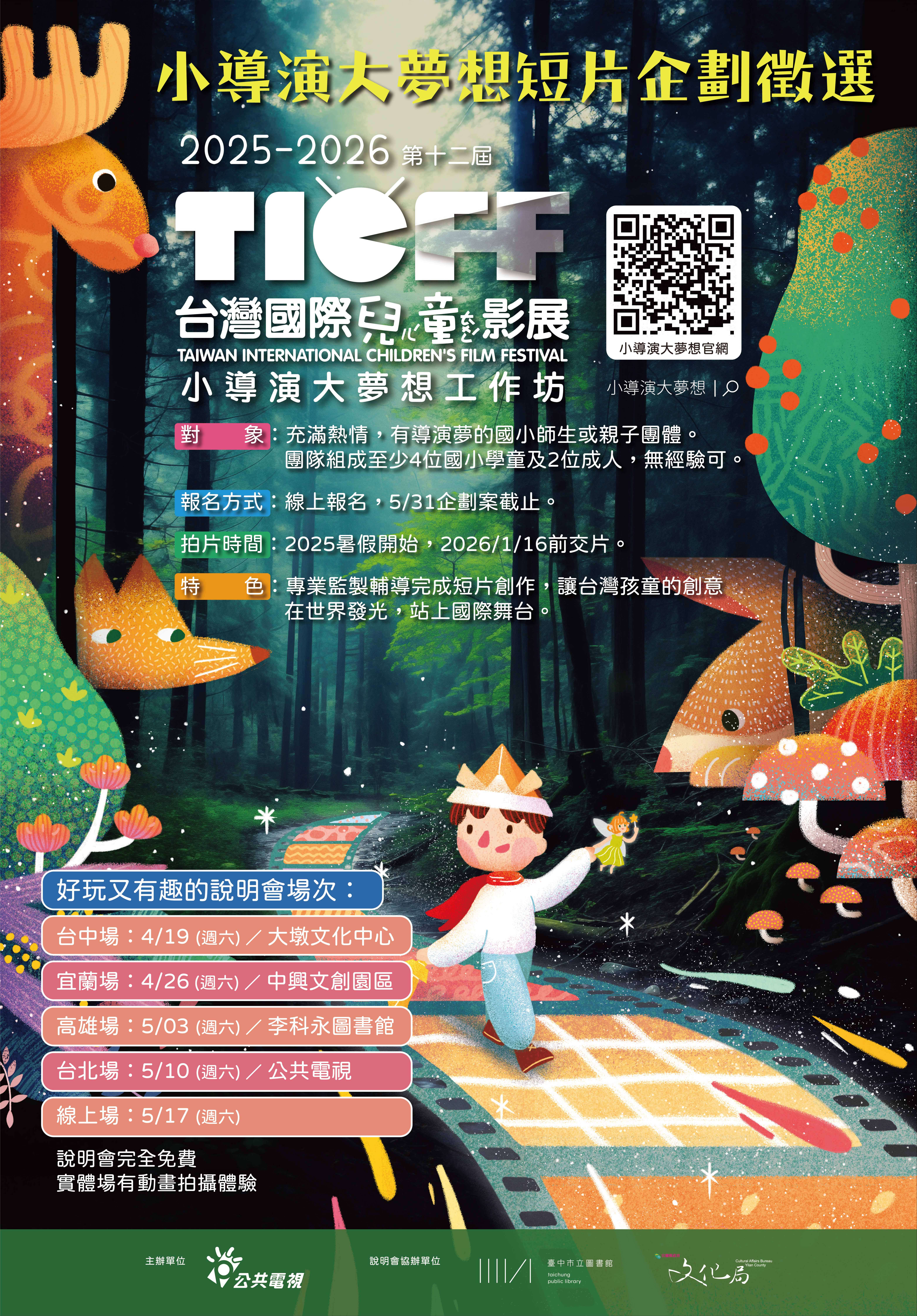 三、「兒童短片企劃案徵選」於2025/5/31截止收件,歡迎國小 師生、親子團隊組隊上網報名。提出拍片企劃參加徵選, 入選團隊可享整套拍片輔導資源,完成短片擇優送國際參展。相關活動細節請上活動官網 https://www.pts.org.tw /dreamer12/