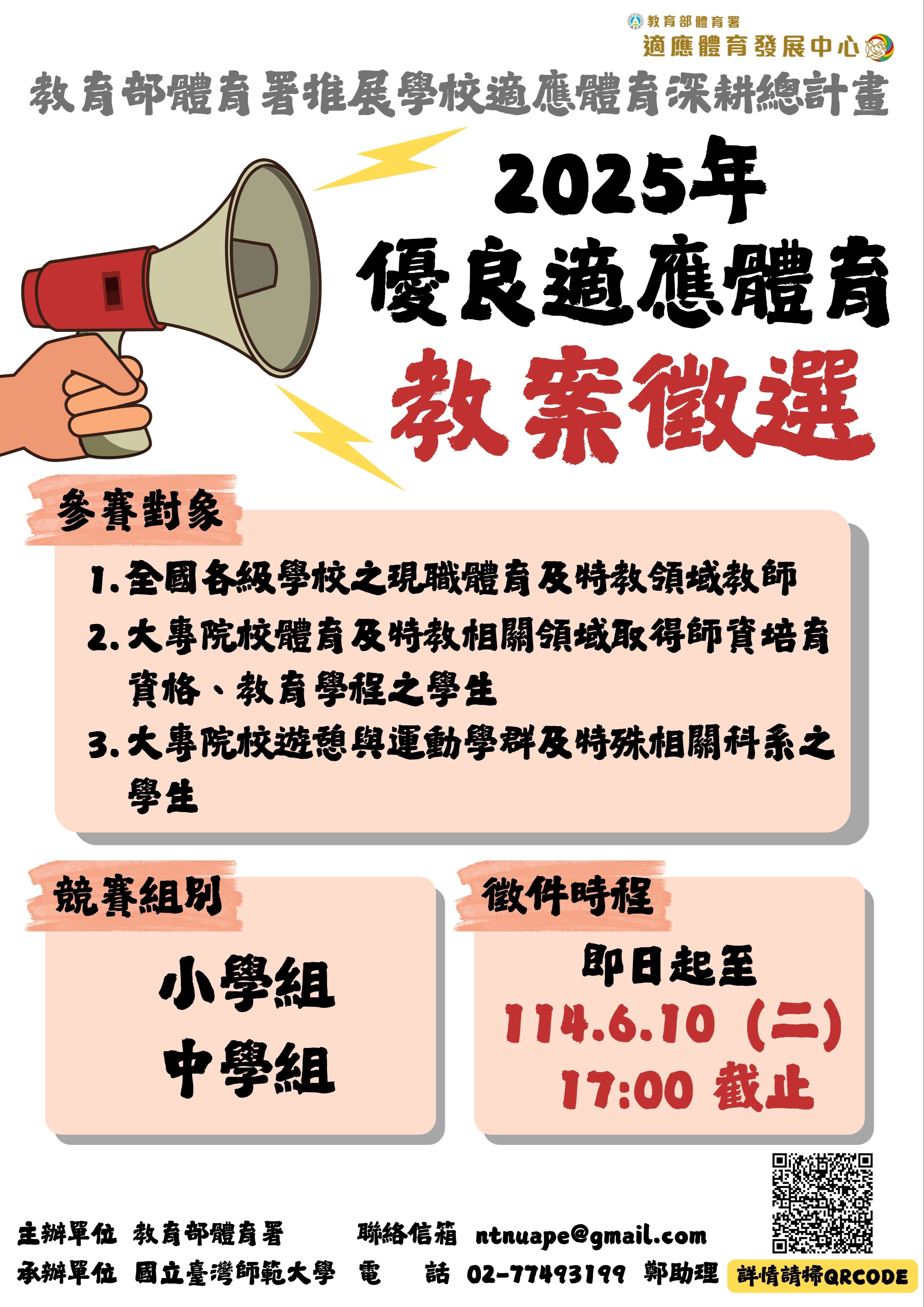 二、為鼓勵特殊教育與運動教育人員研發適應體育教材,將融 合概念及身體素養融入各項體育教學活動中,幫助身心障 礙學生與一般學生在運動中一起學習與成長,教育部體育 署特委請國立臺灣師範大學辦理旨揭活動。