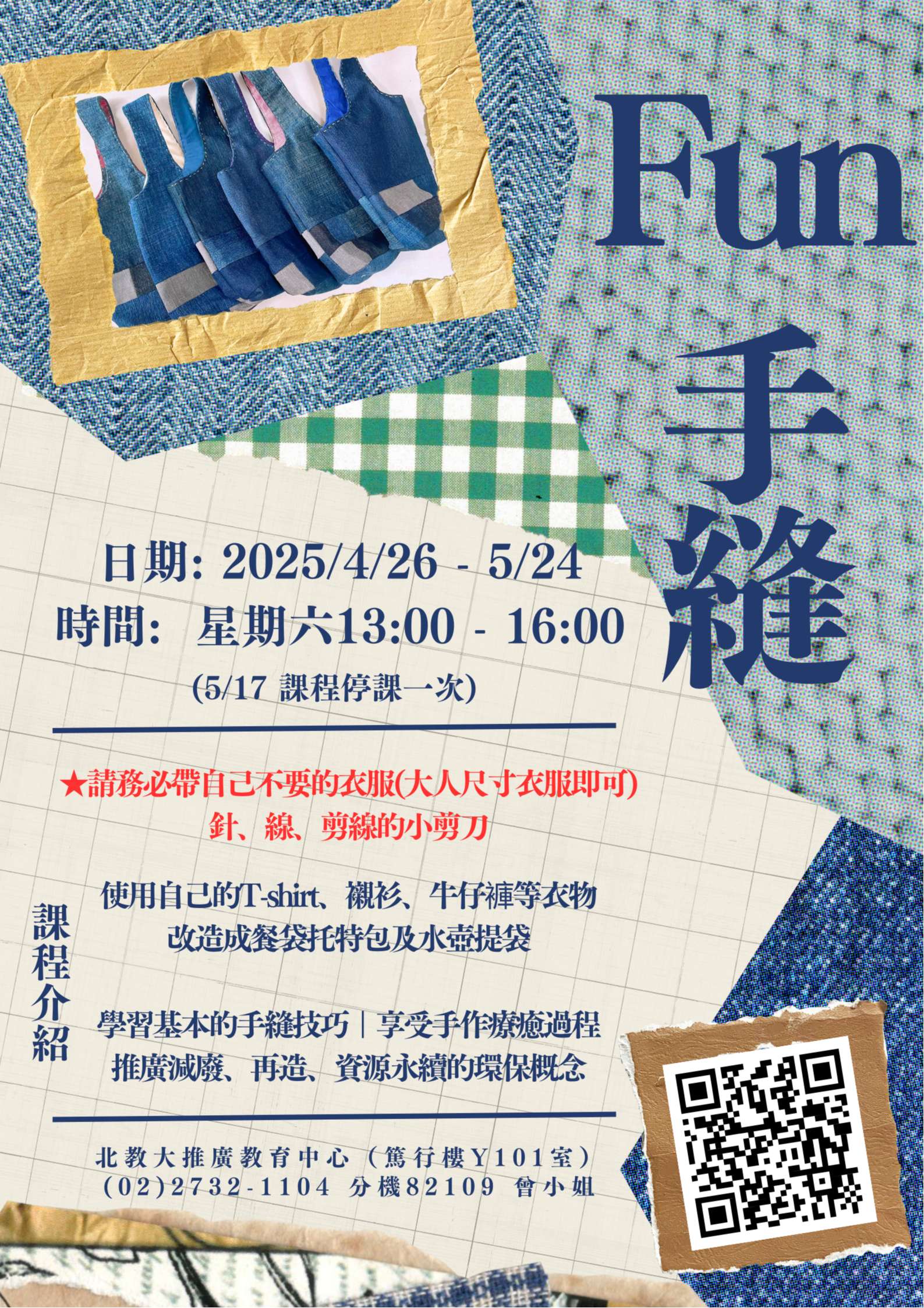 關報名網址如下:Fun手縫(HandMay五月場) https://cce.ntue.edu.tw/course/5629。