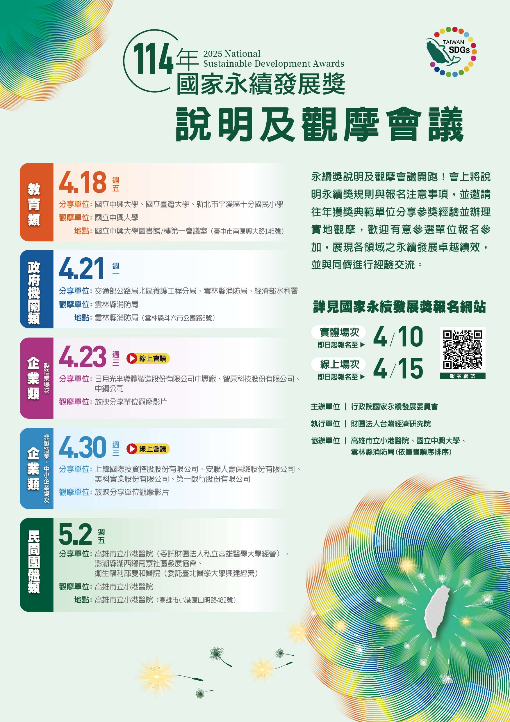 為增進各界對於國家永續發展獎之瞭解,並促進永續發展 相關經驗互相交流與分享,行政院國家永續發展委員會另 舉辦「114年國家永續發展獎說明及觀摩會議」,可免費線上報名,歡迎有意參加選拔者踴躍參加,教育類場次資訊 如下: (一)時間:114年4月18日(星期五) (二)地點:臺中國立中興大學圖書館7樓第一會議室(臺中 市南區興大路145號) (三)報名網址:https://tier.surveycake.biz/s/aqAXY