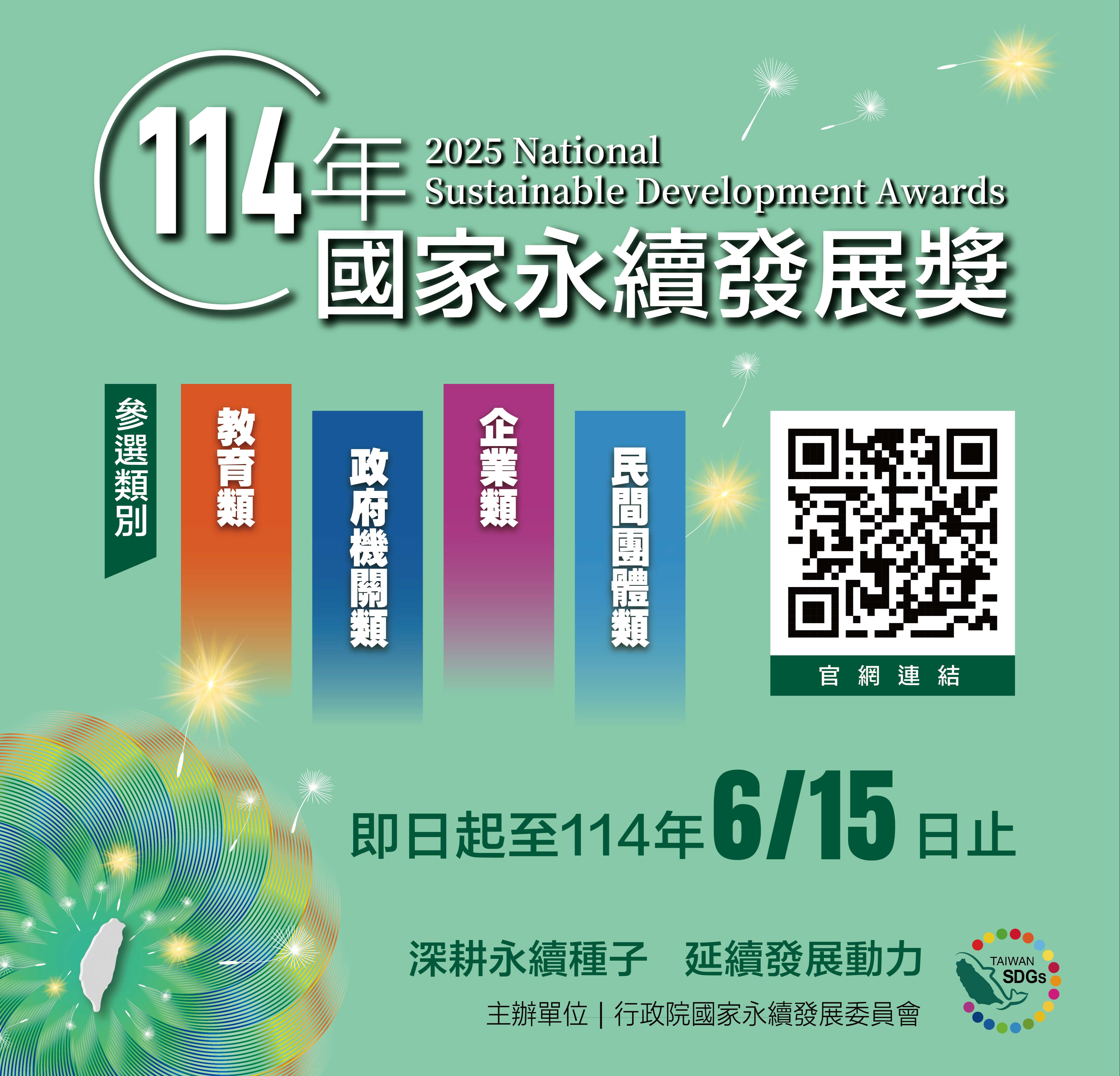 「114年國家永續發展獎」採網路線上報名方式,請有意參 加教育類選拔者,參酌選拔表揚計畫,於114年6月15日前 至國家永續發展獎網站,填列報名表格並上傳相關資料, 完成報名程序(報名網址:https://ncsdaward.ndc.gov. tw/)。
