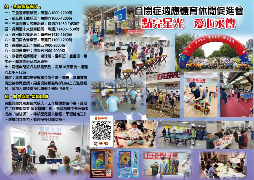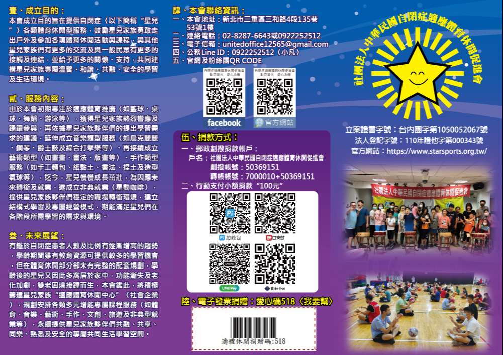 本會長期致力於自閉症者〈以下簡稱“星兒”〉各項體育 〈籃球、桌球、水適能、舞蹈等〉及休閒〈藝術創作、音 樂培養、手作工藝等〉等服務,期能提供星兒家庭專屬合 適的學習環境,不斷成長〈簡介單張如附件一〉。