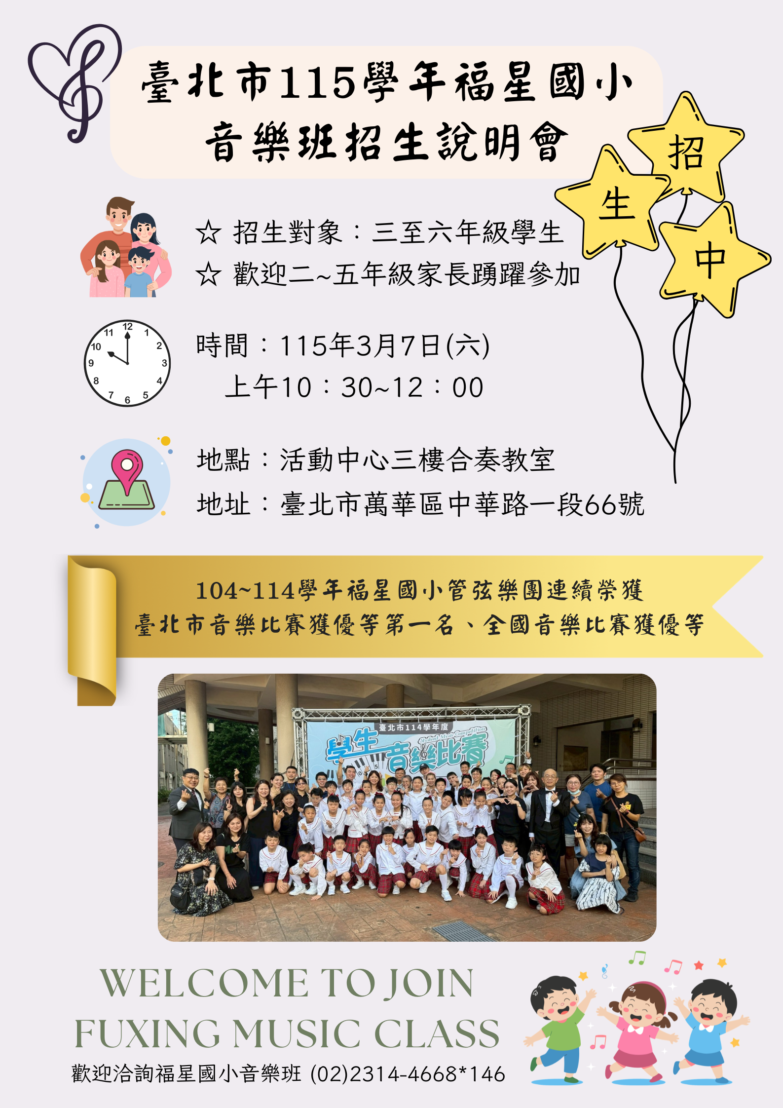 二、招生說明會資訊如下:時間:115年3月7日星期六上午10: 30。地點:福星國小學生活動中心三樓合奏教室。(臺北市 萬華區中華路一段66號,捷運北門1號出口站或西門町6號 出口)活動內容:簡介本校藝術才能音樂班及114學年度入 學考試相關內容,並介紹音樂班教學環境與教育特色,以 及國中升學管道之最新資訊。