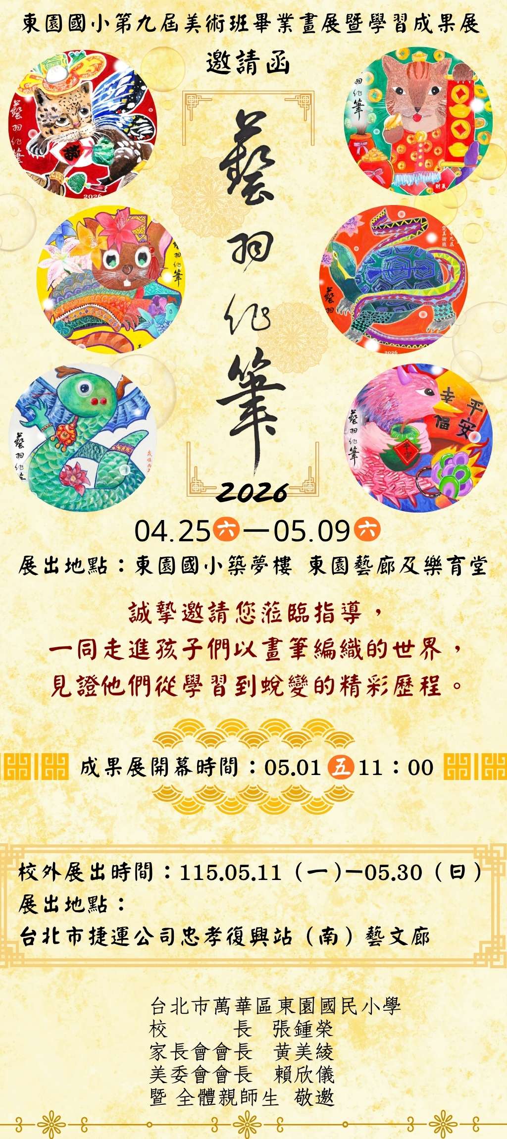 一、東園國小藝術才能美術班辦理成果展,畫展主題為【藝羽 化筆】。